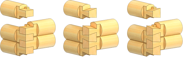 После вырубки чаши плотность подгонки проверяют пробной установкой бревна. Глубина вырубки должна быть такова, чтобы верхние бревна были подняты относительно нижних на половину их диаметра. Верх уложенных бревен выравнивают, придавая им круглую или слегка овальную форму. Чтобы сруб был устойчивым, желательно каждый ряд бревен связывать друг с другом круглыми или прямоугольными шипами (нагелями), которые предотвращают боковой раскат бревен сруба. Нагели могут быть круглыми или иметь в разрезе прямоугольное сечение. Эти «деревянные гвозди» изготавливают из сухой плотной древесины (дуб, бук, ясень) и устанавливают на расстоянии 1,5–2 м друг от друга. Количество и места установки нагелей следует обязательно оговорить на этапе монтажа сруба. Компании обычно стараются сэкономить время и скрепляют бревна через два, а то и три венца. Это неправильно, в оптимальном варианте все венцы должны скрепляться между собой. Насаживают бревна на места врубки ударами деревянной чурки или кувалдой, проверяя вертикальность плоскости бревен строительным отвесом или уровнем. После установки двух венцов, включая бревна оклада, приступают к установке стоек коробки входной двери.